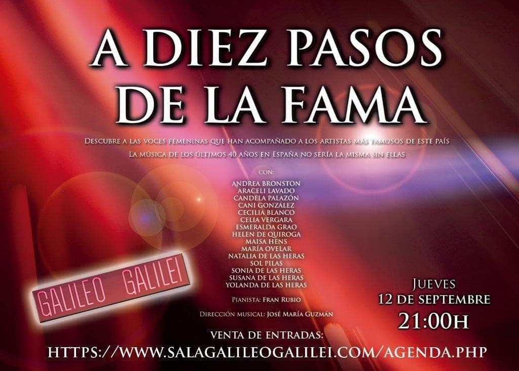 Publicado por: Celia Vergara A Diez Pasos De La Fama. 12 de septiembre en Galileo Galilei25 de octubre Auditorio de Las Rozas2 de Noviembre Centro Arte Alcobendas10 de Noviembre Adolfo Marsillac San Sebastián de los Reyes